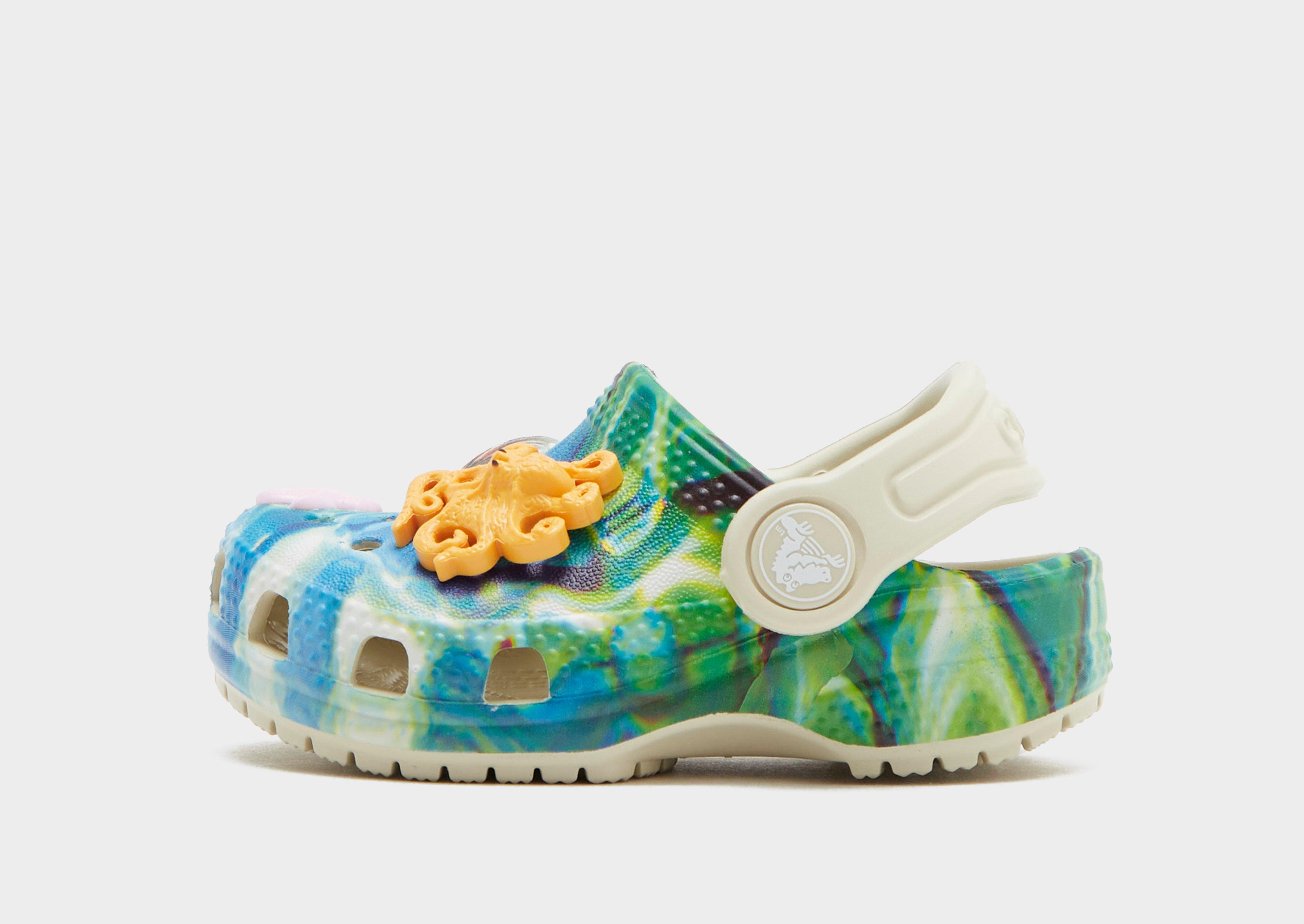 Verleihe deinen Kids einen neuen Sommer-Look mit den Classic Clog Baby-Sandalen von Crocs. Diese verkleinerten Clogs sind in der Farbe Sea Bone gehalten und mit vom Meer inspirierten Motiven versehen. Sie bestehen aus dem wasserfreundlichen Croslite-Gewebe von Crocs und bieten maximalen Komfort für die kleinen Füße. Außerdem besitzen sie einen verstellbaren Fersenriemen für sicheren Halt und sitzen auf einem konturierten Fußbett für zusätzliche Dämpfung. Eine strukturierte Außensohle bietet maximalen Grip, während das klassische Logo und eine Reihe von Jibbitz, darunter Muscheln, Fisch und mehr das Design abrunden. Bitte beachte: Crocs fallen weit aus. Wenn du schmale Füße hast, empfehlen wir dir, eine Nummer kleiner zu wählen. Bei Crocs ist die US-Größe auf der Sohle eingeprägt.
