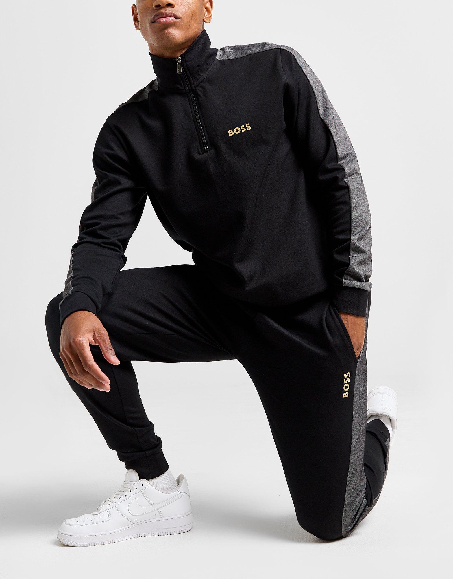 Zeit für Premium-Vibes mit der BOSS Trainingshose für Herren. Diese Hose ist in Schwarz gehalten und mit grauen Seitenpaneelen versehen. Sie besitzt einen durch Kordelzug verstellbaren Hosenbund, elastische Bündchen und offene Seitentaschen für deine Hände und Utensilien. Die Hose besteht aus einem weichen, dehnbaren Baumwoll-Polyester-Stoff, um absoluten Tragekomfort zu bieten. Abgerundet wird das Design durch das BOSS-Logo auf dem linken Hosenbein. Waschmaschinengeeignet. Unser Model ist 1,83 m groß und trägt Größe M.
