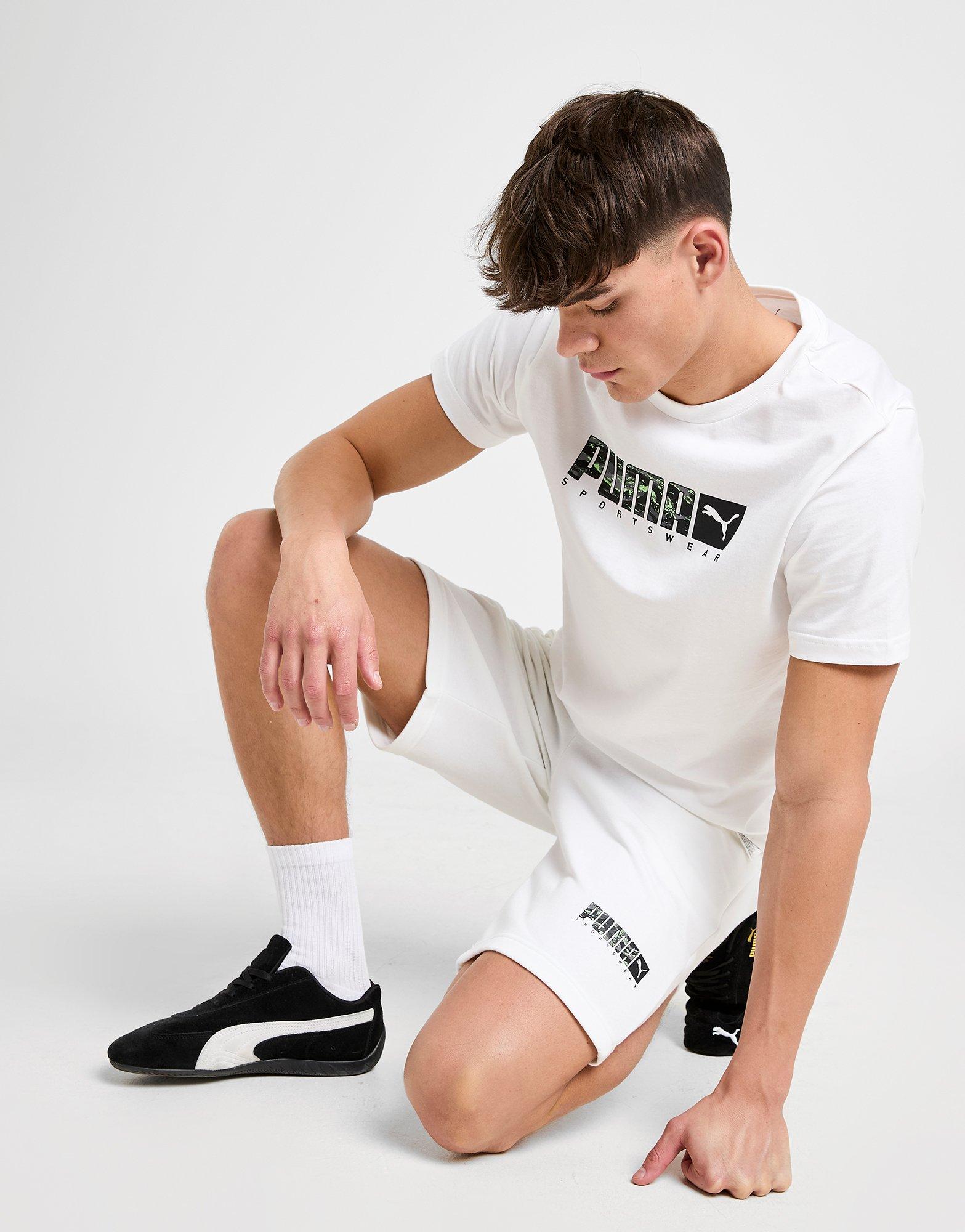 Upgrade deinen Alltags-Look mit den Sportswear Herren-Shorts von PUMA. Diese JD-exklusiven Shorts sind in Weiß gehalten und bestehen aus weichem Baumwoll-Fleece. Außerdem verfügen sie über einen elastischen Bund mit Kordelzug für einen sicheren Halt, während Seitentaschen Platz für deine Utensilien bieten. Abgerundet wird das Design durch das PUMA Sportswear-Logo im Camouflage-Optik über dem Saum. Waschmaschinengeeignet. Unser Model ist 1,88 m groß und trägt Größe M.